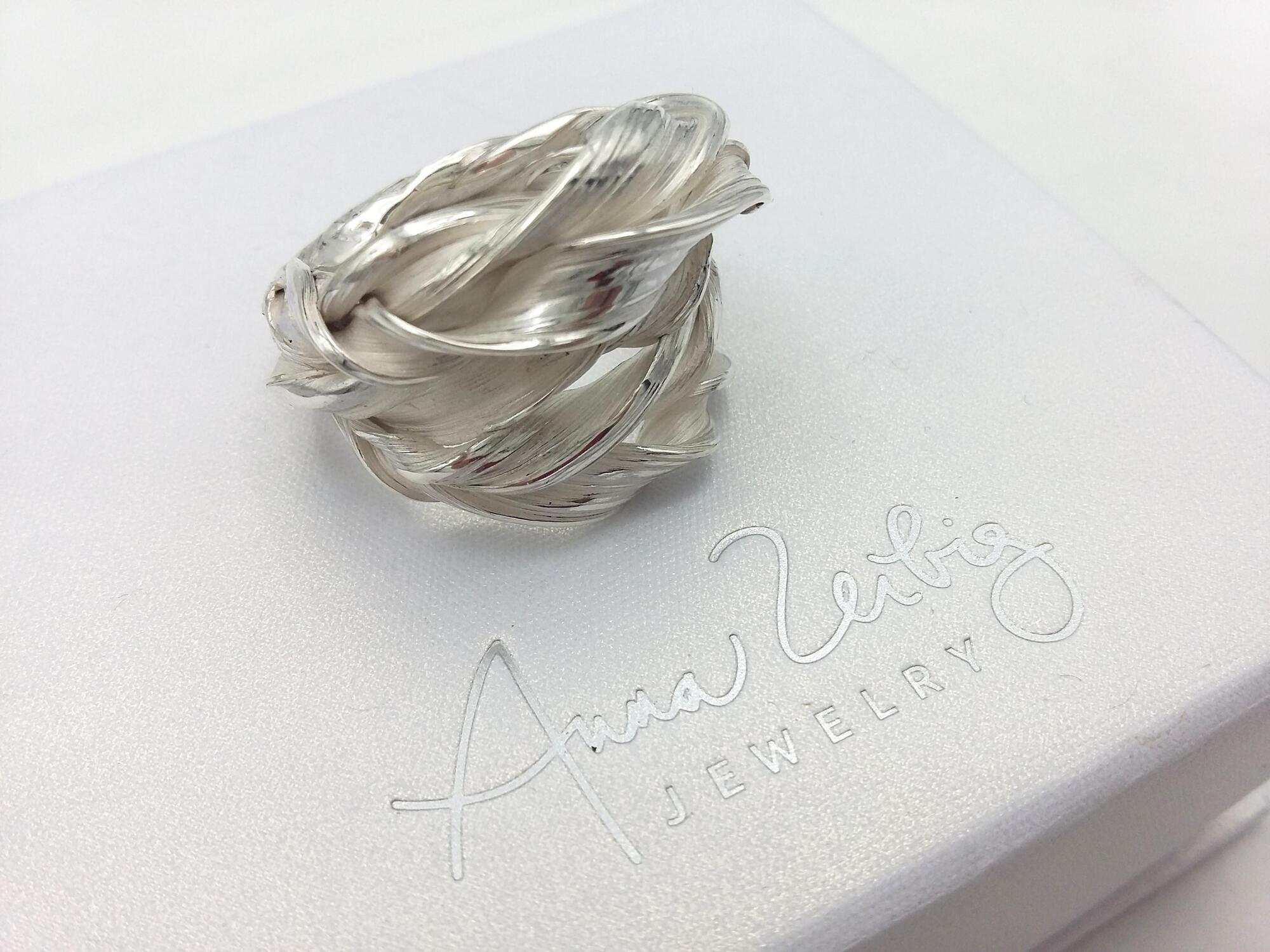 Unique handmade ring using an ancient Japanese technique called Mitsuro Hikime. This technique is nearly on its way to extinction. This method requires a calm mindset, resilience to failure and an open mind to accidental and unique outcomes. Each piece is one of a kind and impossible to replicate. Anna Zeibig is one of the few jewelry artists in the world keeping this beautiful technique alive.