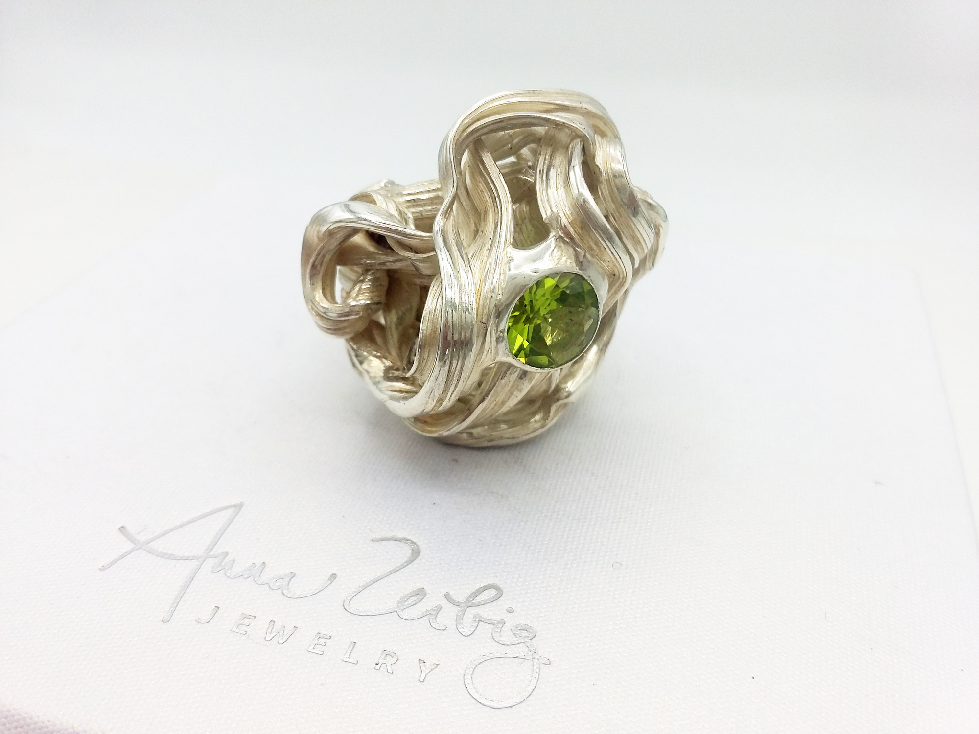 A big showstopper ring for your special ocasion, a true statement for self-confident woman. A gorgeous olivin stone is set in the middle, this stone has an earthy luminosity, that evokes the freshness and vitality of nature. This ring is handmade using an ancient Japanese technique called Mitsuro Hikime. This technique is nearly on its way to extinction. This method requires a calm mindset, resilience to failure and an open mind to accidental and unique outcomes. Each piece is one of a kind and impossible to replicate. Anna Zeibig is one of the few jewelry artists in the world keeping this beautiful technique alive. Please keep in mind that a new piece can't be exactly like this. This ring is size 15/55/US 7 1/2.