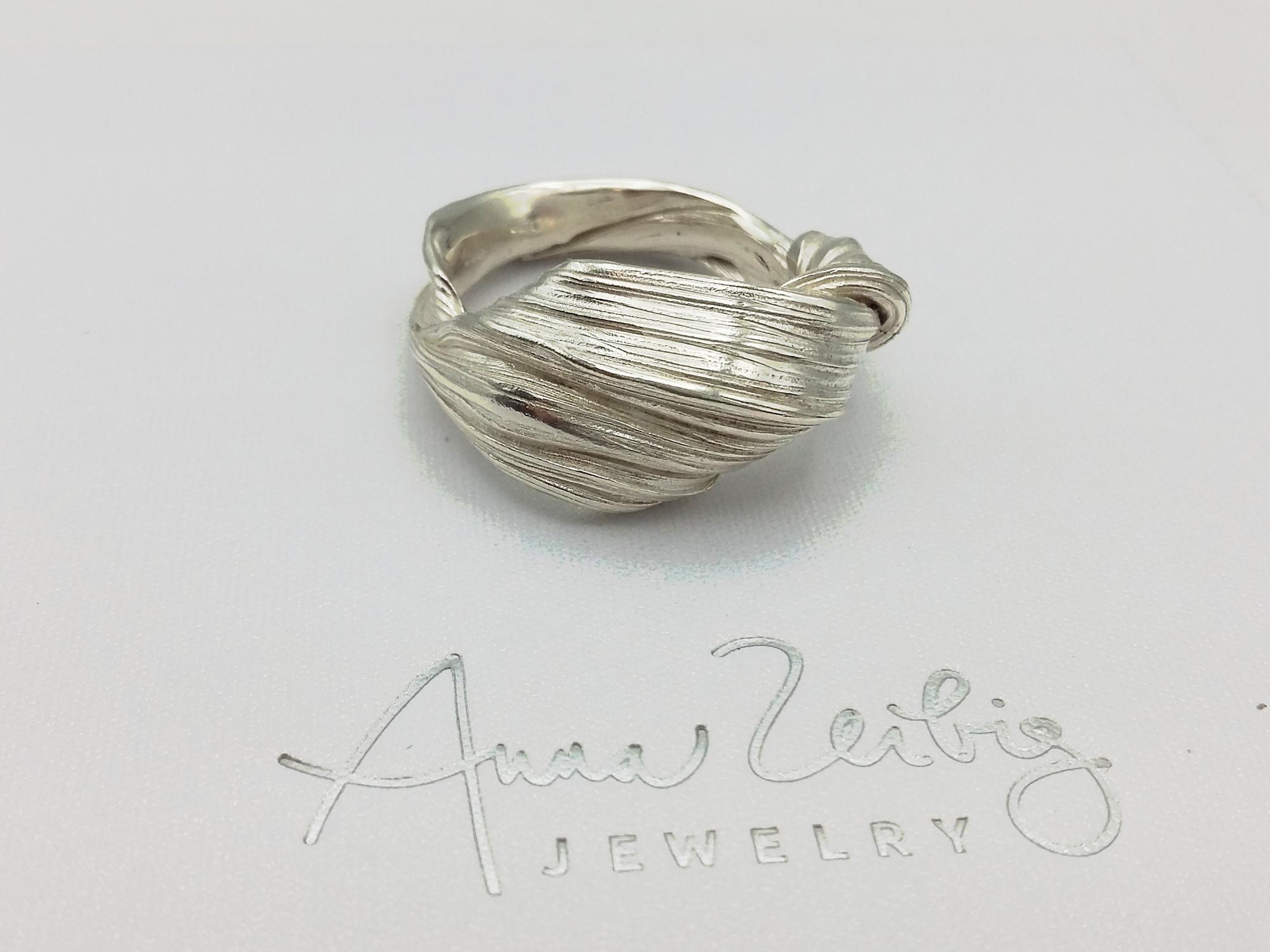Curvy and dramatic ring using an ancient Japanese technique called Mitsuro Hikime. This technique is nearly on its way to extinction. This method requires a calm mindset, resilience to failure and an open mind to accidental and unique outcomes. Each piece is one of a kind and impossible to replicate. Anna Zeibig is one of the few jewelry artists in the world keeping this beautiful technique alive. Do you prefer in gold? Please contact for quotation!