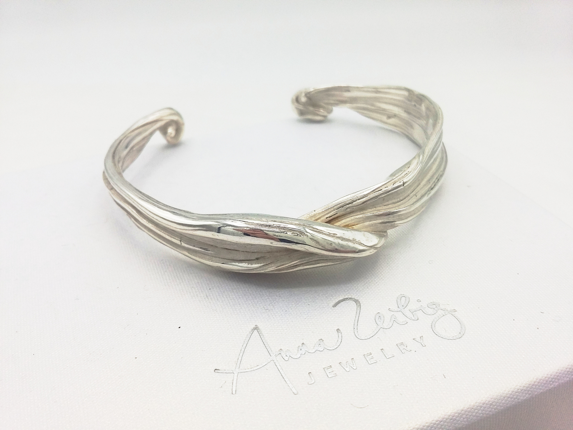 Unique handmade bracelet using an ancient Japanese technique called Mitsuro Hikime. This technique is nearly on its way to extinction. This method requires a calm mindset, resilience to failure, and an open mind to accidental and unique outcomes. Each piece is one of a kind and impossible to replicate. Anna Zeibig is one of the few jewelry artists in the world keeping this beautiful technique alive. If it's sold out but you'd like a similar one, please send a message. Please keep in mind that a new piece can't be exactly like this. Do you prefer gold or gold plated? Please contact for a quotation!