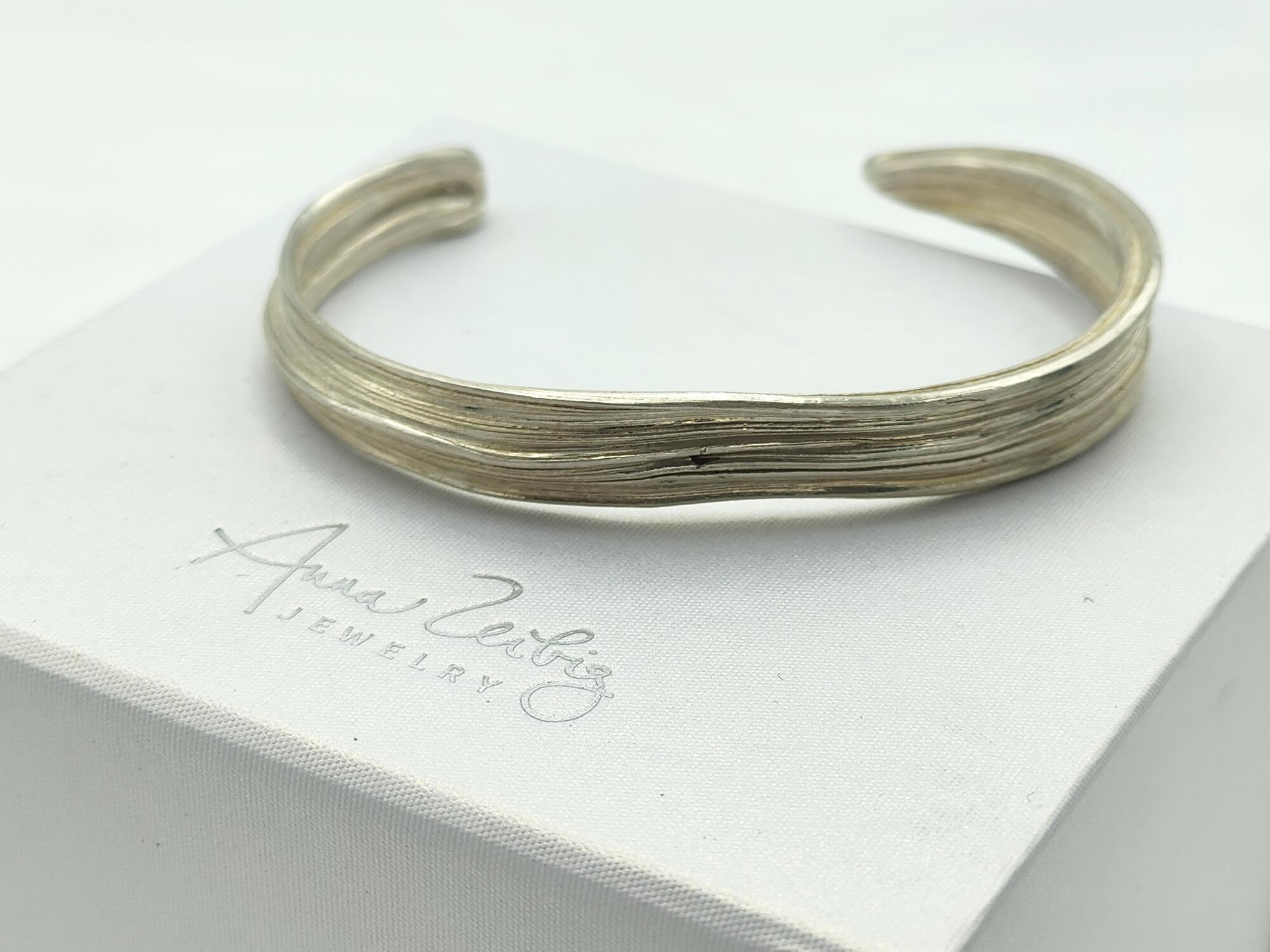 Unique handmade bracelet using an ancient Japanese technique called Mitsuro Hikime. This technique is nearly on its way to extinction. This method requires a calm mindset, resilience to failure, and an open mind to accidental and unique outcomes. Each piece is one of a kind and impossible to replicate. Anna Zeibig is one of the few jewelry artists in the world keeping this beautiful technique alive. If it's sold out but you'd like a similar one, please send a message. Please keep in mind that a new piece can't be exactly like this. Do you prefer gold or gold plated? Please contact for a quotation!