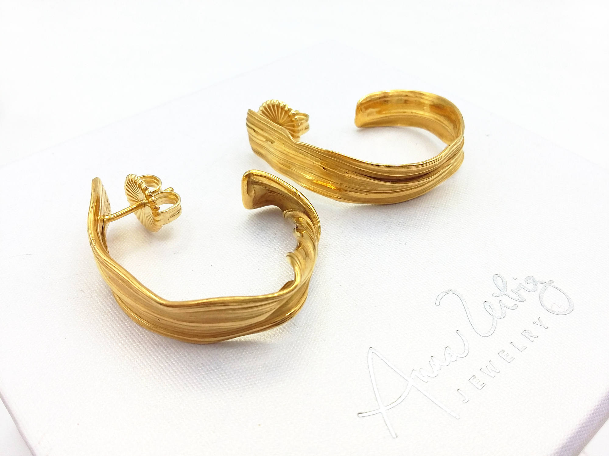 Very asymmetric handmade earrings in gold plated silver using an ancient Japanese technique called Mitsuro Hikime. Each piece is literally one of a kind, there is only 1 pair exactly like in the photo. Do you prefer gold? Please contact for a quotation!