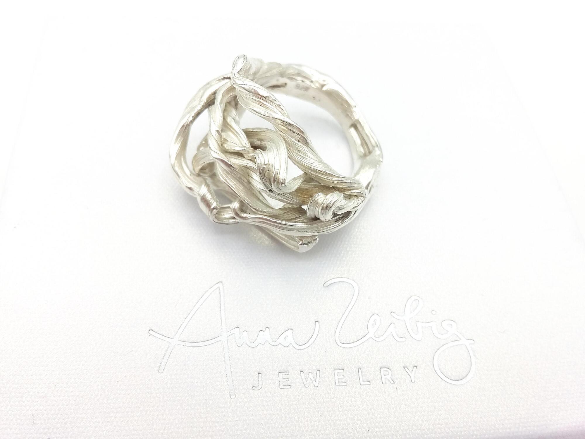 Unique handmade ring using an ancient Japanese technique called Mitsuro Hikime. This technique is nearly on its way to extinction. This method requires a calm mindset, resilience to failure and an open mind to accidental and unique outcomes. Each piece is one of a kind and impossible to replicate. Anna Zeibig is one of the few jewelry artists in the world keeping this beautiful technique alive. This ring is size 12/52/US 6