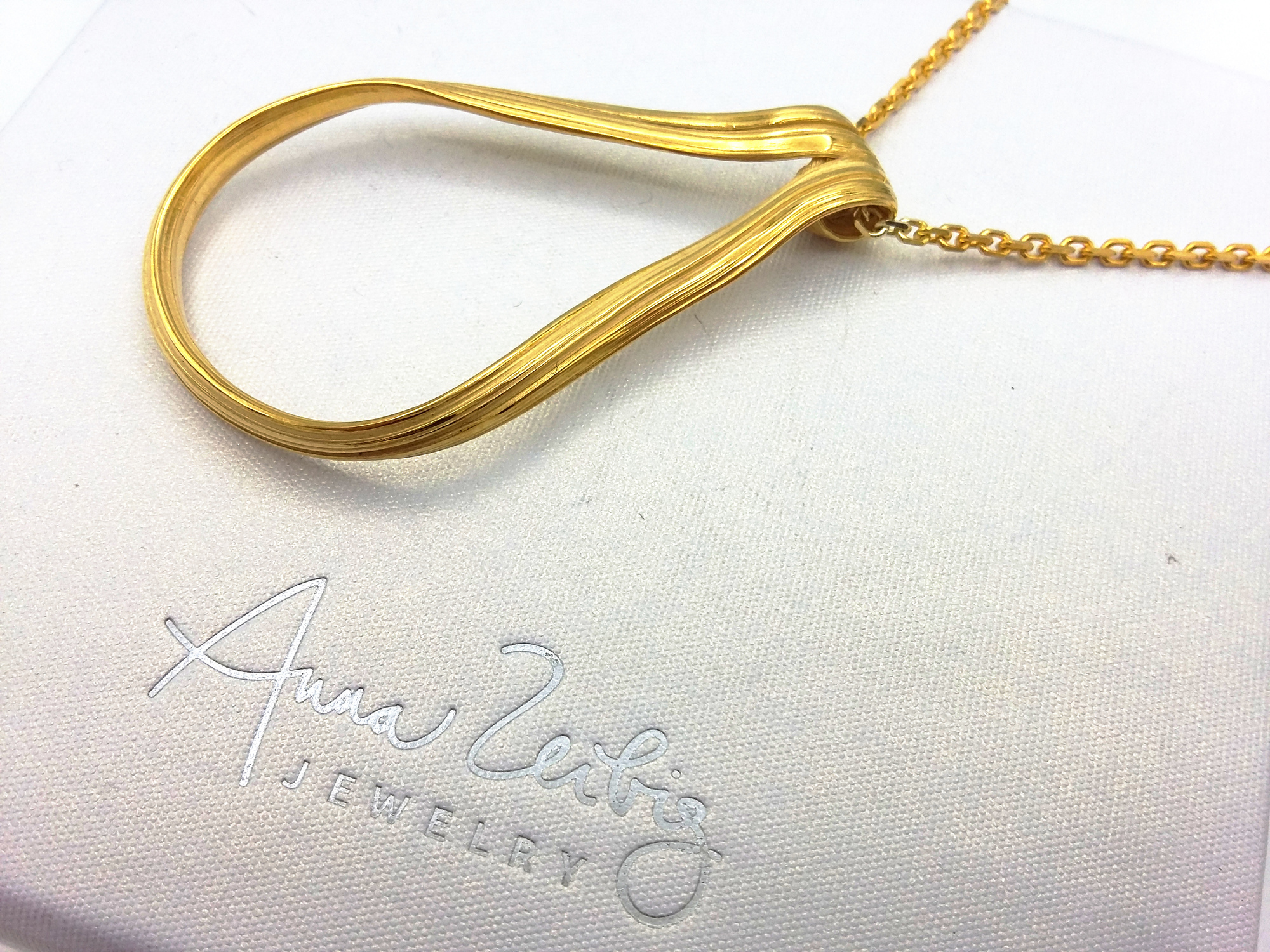 Elegant goldd plated silver necklace using an ancient Japanese technique called mitsuro hikime. This method requires a calm mindset, resilience to failure, and an open mind to accidental and unique outcomes. Each piece is one of a kind and impossible to replicate. Anna Zeibig is one of the few jewelry artists in the world keeping this beautiful technique alive by teaching her craft worldwide.