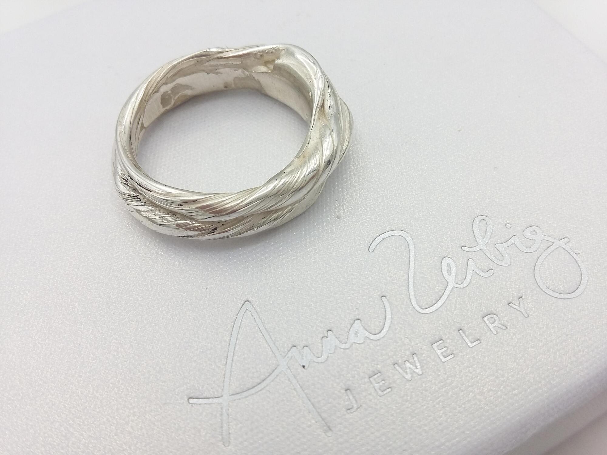 Unique handmade ring using an ancient Japanese technique called Mitsuro Hikime. This technique is nearly on its way to extinction. This method requires a calm mindset, resilience to failure and an open mind to accidental and unique outcomes. Each piece is one of a kind and impossible to replicate. Anna Zeibig is one of the few jewelry artists in the world keeping this beautiful technique alive.