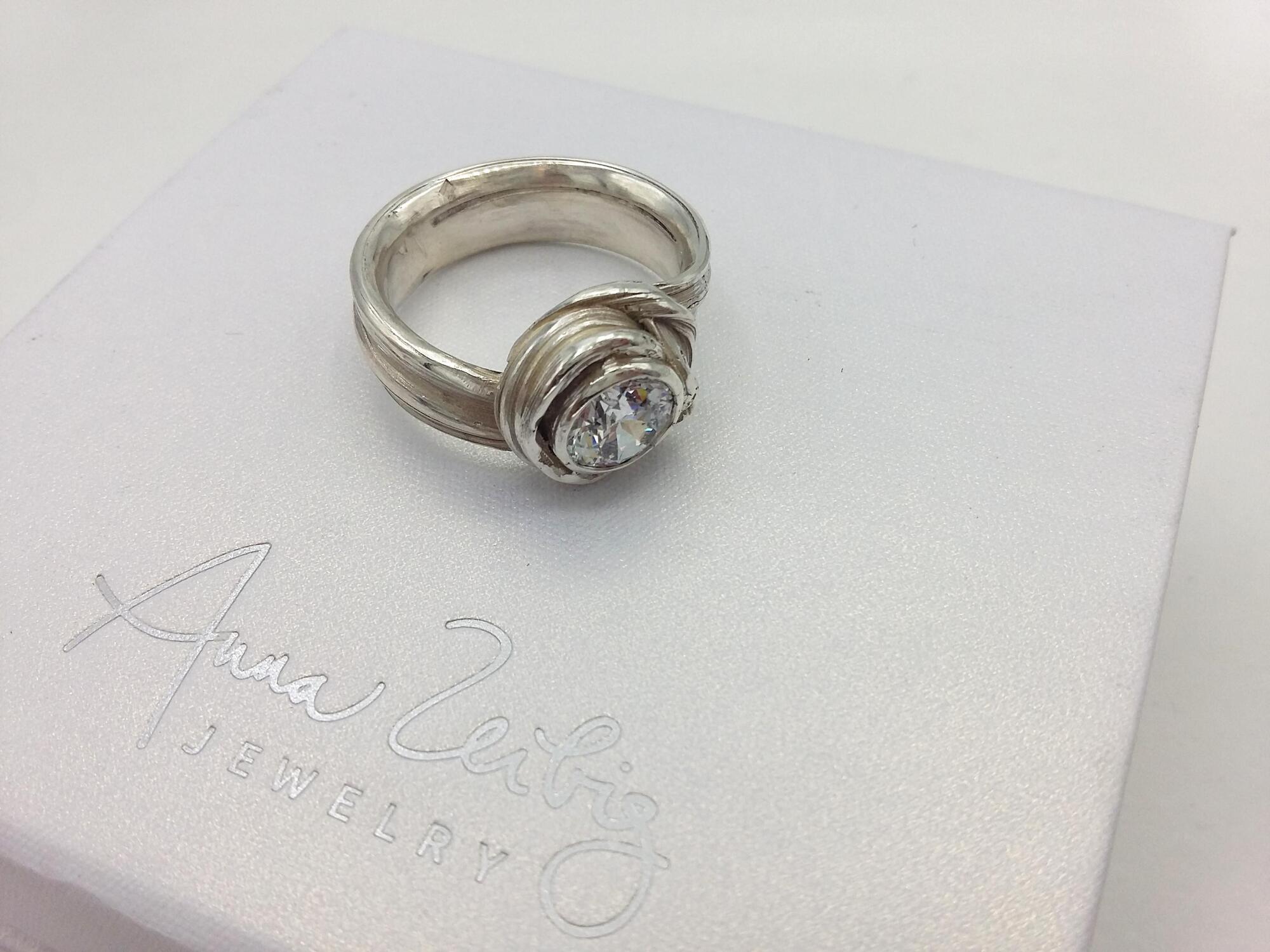 Gorgeous statement ring featuring a white zirconia. This ring is meticulously crafted using an ancient Japanese wax technique that ensures every detail is captured with precision and authenticity. A truly one-of-a-kind piece that is sure to be treasured for years to come.