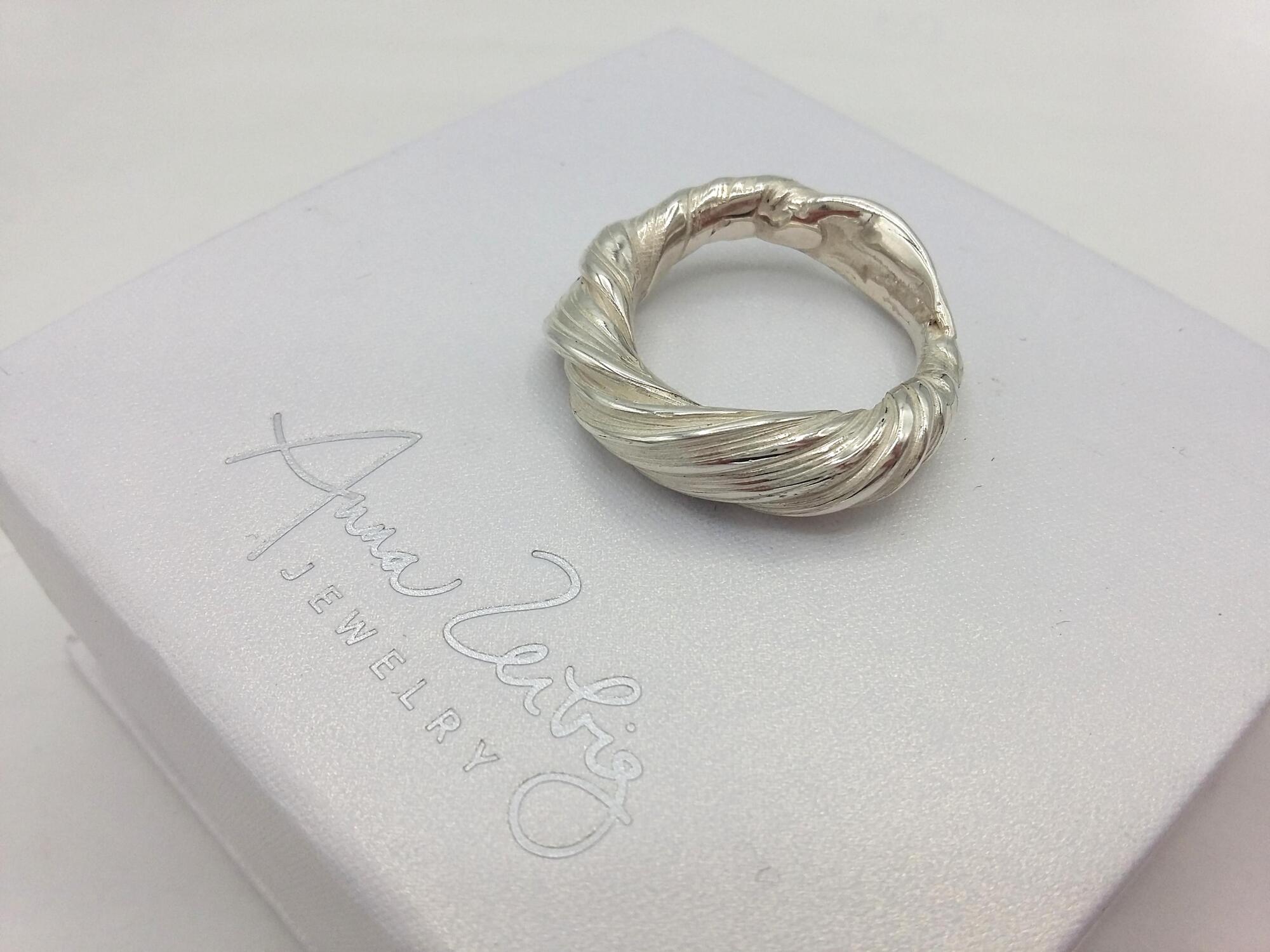 Unique handmade ring using an ancient Japanese technique called Mitsuro Hikime. This technique is nearly on its way to extinction. This method requires a calm mindset, resilience to failure and an open mind to accidental and unique outcomes. Each piece is one of a kind and impossible to replicate. Anna Zeibig is one of the few jewelry artists in the world keeping this beautiful technique alive.