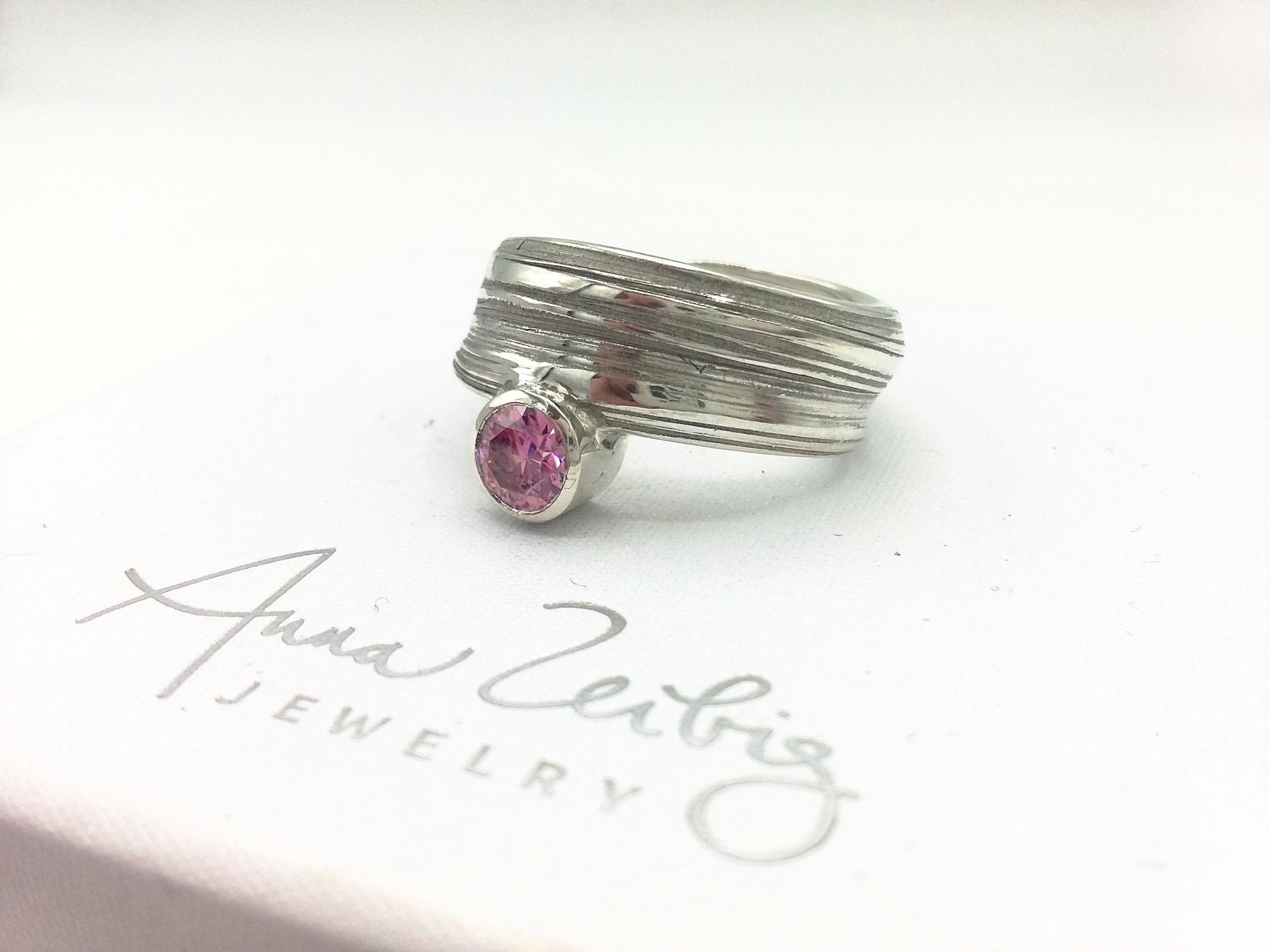 Extraordinary one of a kind ring featuring a 0.6 ct pink moissanite stone. Did you know that moissanite is almost as hard as diamond and has even more sparkle than diamond? This ring was carefully handcrafted by using an ancient Japanese technique called Mitsuro Hikime. This technique is nearly on its way to extinction. This method requires a calm mindset, resilience to failure and an open mind to accidental and unique outcomes. Each piece is one of a kind and impossible to replicate. Anna Zeibig is one of the few jewelry artists in the world keeping this beautiful technique alive. This ring is size 14/54/US 7.